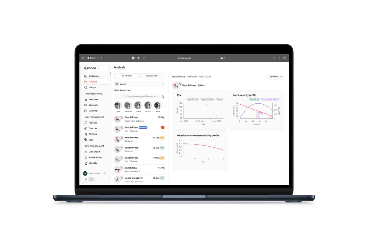 The history and analysis sections of the portal give you access to data collected via the Enode app. History shows what was performed, the metrics (if using a sensor), and 1RM predictions for the session. The analysis section breaks down each lift for an athlete, showing their 1RM progress, velocity profile, and a reps-in-reserve velocity profile.