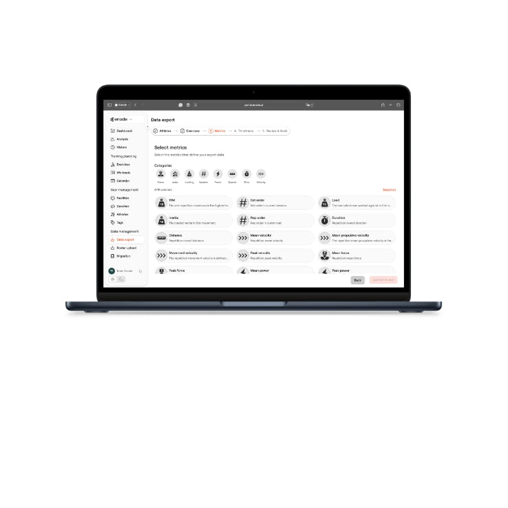 You can export all data stored in the portal. Select which metrics, athletes, and exercises individually, or export everything; the choice is yours. The portal takes you through a step-by-step process to make it as easy as possible.