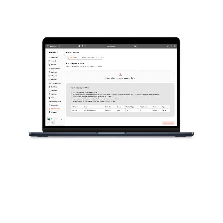 If you have many athletes to add to your account, you can upload them all in one go via a CSV file. An example is given to make it as seamless as possible.